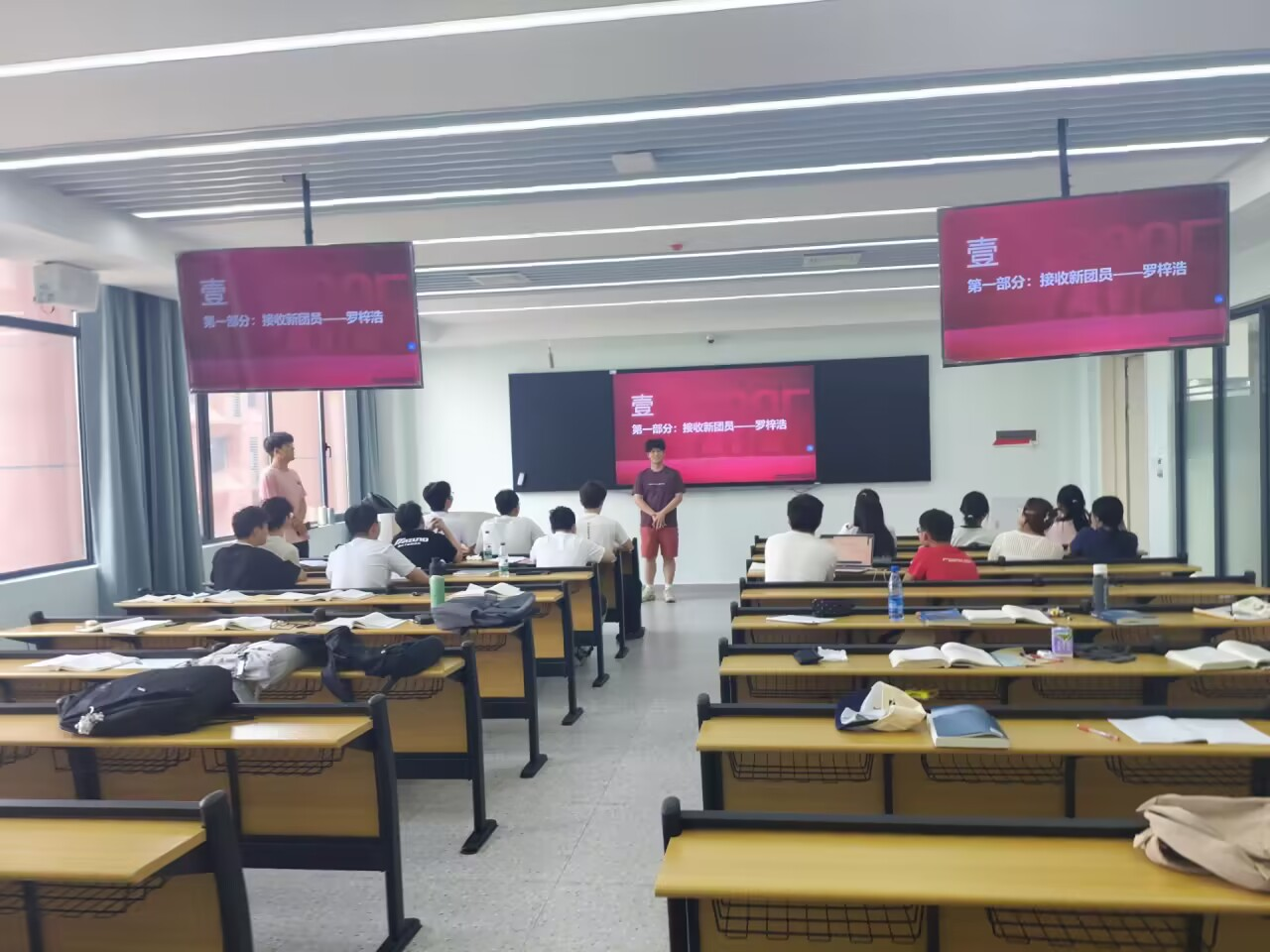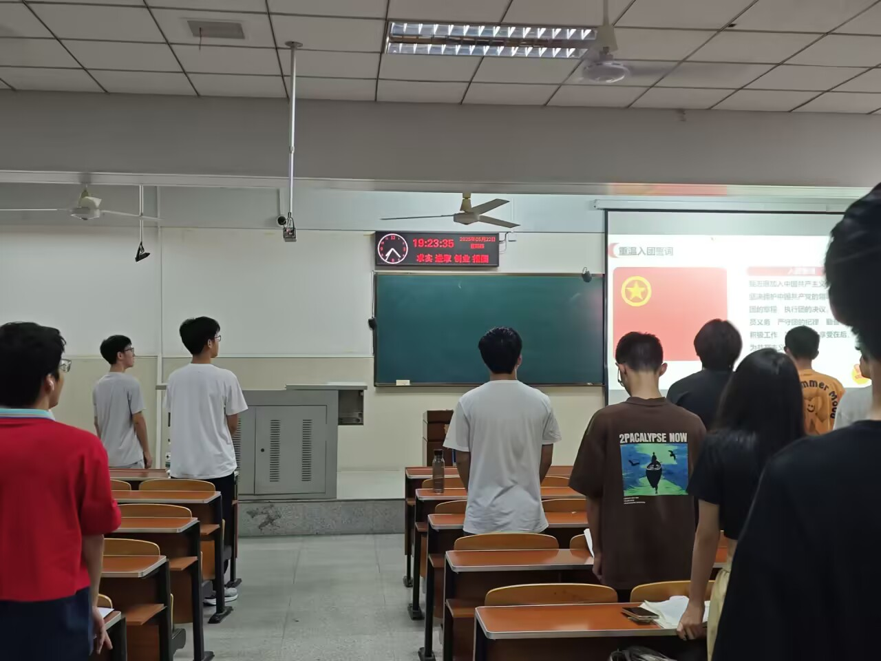 庄严的宣誓环节中,在团支书的带领下,全体发展对象及所有在场团员紧握右拳,高声诵读入团誓词,“我志愿加入中国共产主义青年团……”。铿锵有力的誓言回荡在会场,彰显了青年学子们坚定不移跟党走的决心和对团组织的无限忠诚。紧接着,全体成员齐声高唱团歌《光荣啊,中国共青团》,激昂的旋律进一步激发了同学们心底的使命感和荣誉感。