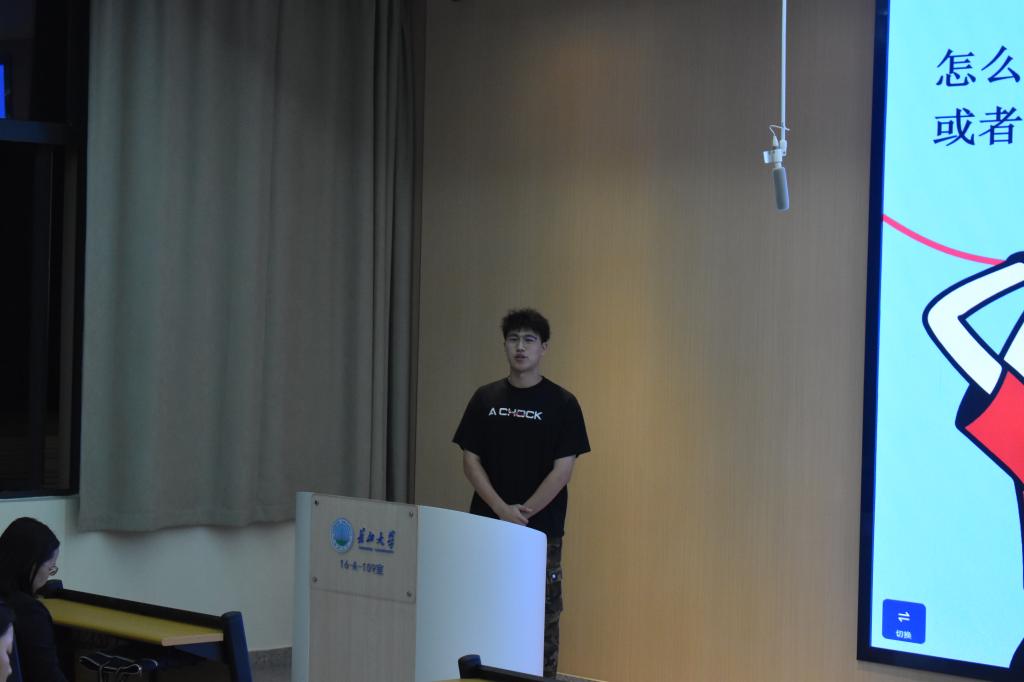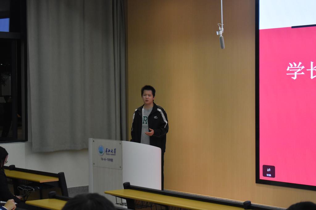随后,获国家级学科竞赛七项奖项的张义勇学长为大家分享经验。他结合自己在比赛中的亲身经历,鼓励大家敢闯敢创,从校级老员工创新创业项目起步,逐步提升自己的能力,进而挑战更高层次的赛事。张义勇学长强调要合理地选择想要参加的竞赛并科学地规划备赛时间,从而有效提升备赛效率。