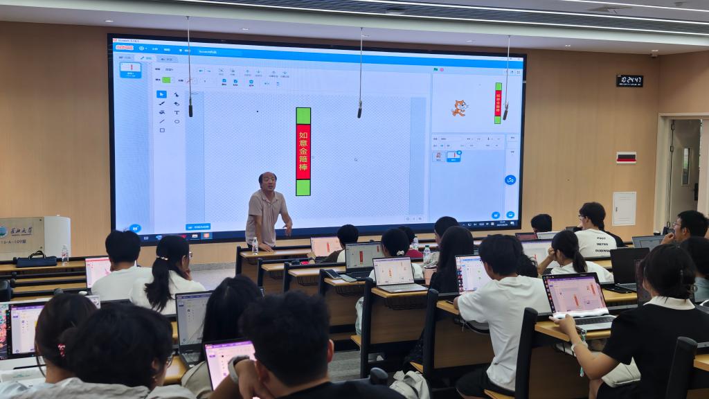 在编程知识教学环节结束后,靳国兴老师结合自身丰富的教学经验,针对未来志愿服务工作中少儿编程教学展开重点指导。他强调,小朋友们的注意力集中时间较短,教学时要注重节奏把控,每20分钟左右穿插一次互动游戏,既能巩固知识,又能活跃课堂气氛。在课程内容设计上,靳老师展示了多个极具创意的教学案例,例如通过编程控制卡通角色制作金箍棒,将编程指令融入游戏关卡中,让小朋友在娱乐中掌握编程基础。此外,他还提醒同学们,要善于观察小朋友们在学习过程中的表现,对于理解能力较强的孩子,可以引导他们尝试对程序进行优化和创新;对于接受较慢的孩子,则要用鼓励式教学,从简单任务入手,逐步建立他们的信心。