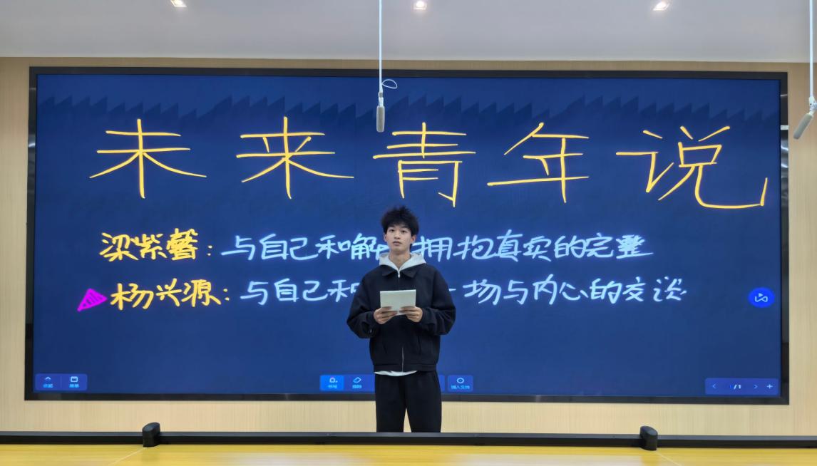 紧随其后,杨兴源同学以《与自己和解:一场与内心的对话》为题,进行了深入浅出的演讲。他从现实中的种种压力着手,一针见血地指出当代青年普遍面临的自我苛责问题:“我们常常以他人的尺度来衡量自身,却忽略了倾听内心的呼唤。”他倡导我们应该如同对待挚友般对待自己,终止无谓的自我攻击。在谈及“拥抱过去”的主题时,他坦诚地分享了自己的心路历程——曾经因为一次比赛的失败,长时间陷入自我否定的漩涡,最终通过每天记录三件值得感激的小事,找回内心的平和。他真挚的叙述,让在场的听众无不为之动容。