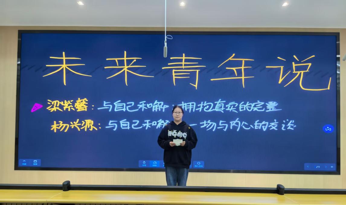 活动开启之际,梁紫馨同学以《与自己和解:拥抱真实的完整》为题,运用充满诗意的言辞,深刻剖析了“和解”的内涵。她提出:“与自己和解,并非是对不足的迁就,而是对生命本质的慈祥拥抱。”在演讲的过程中,她以璞玉作比,强调人性的珍贵在于其完整性而非无瑕。那些我们眼中的缺陷与伤痕,实际上正是塑造我们独一无二个性的碎片。在场的同学们不由自主地坐直了身子,全神贯注地聆听。