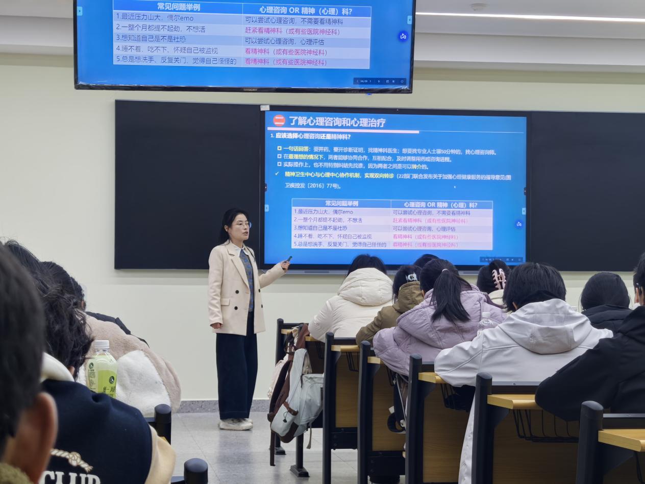 杨湘虹在培训中重点介绍了心理问题识别的“三把尺子”——反常、痛苦、功能失调,并解析从情绪压力到情绪障碍的发展维度,引导员工科学评估心理状态。她还厘清了心理咨询与精神科服务的区别与联系,强调“在理想情况下,二者应协同工作”,并提醒员工遇到严重心理危机时必须及时寻求专业医疗支持。